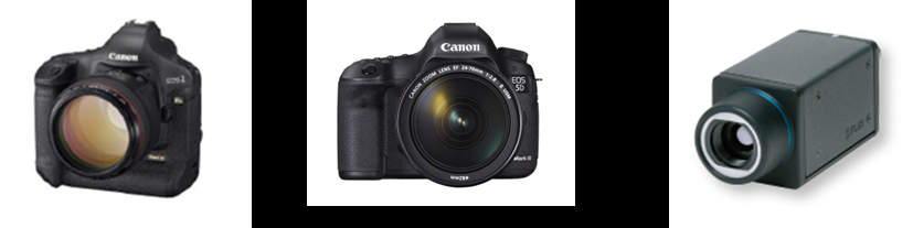 Canon EOS-1DS Mark 3 (left: Red / Green / Blue), Canon EOS-5D Mark 3 camera (centre: Red+Near InfraRed / Green+NIR/ NIR), and FLIR A65 thermal infrared camera (right: 7.5–13 μm).
