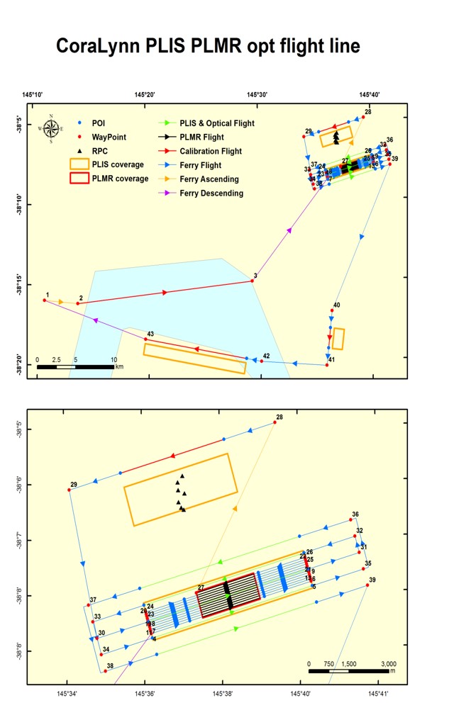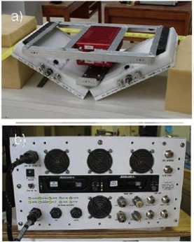 PLIS can measure the surface backscatter at HH, HV, VH, and VV polarisations. The PLIS is composed of two “main” 2x2 patch array antennas inclined at an angle of 30° from the horizontal to either side of the aircraft to obtain push broom imagery over a cross track swath of +/- 45°. Both antennas are able to transmit and receive at V and H polarisations. The antenna’s two-way 6-dB beam width is 51°, and the antenna gain is 9 dBi ± 2 dB. In the cross-track direction, the antenna gain is within 2.5 dB of the maximum gain between 15° and 45°. PLIS has an output frequency of 1.245-1.275 GHz with a peak transmit power of 20 W.