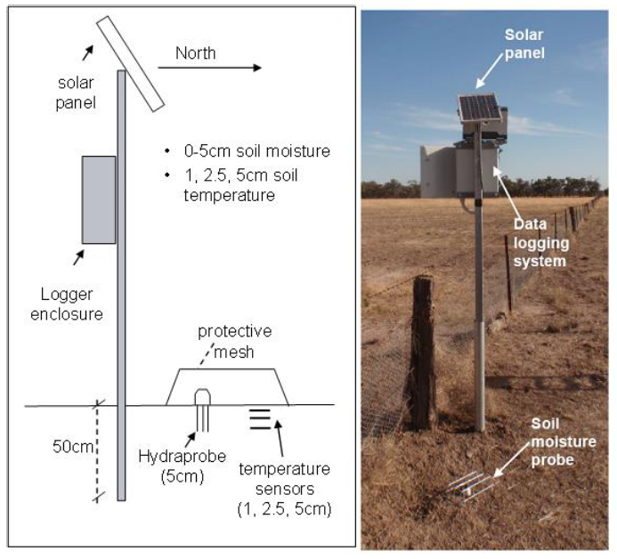 The 24 additional soil moisture sites were installed in late 2009 to support the Soil Moisture Active Passive Experiment (SMAPEx) project. These continuously monitor soil moisture at 0-5 cm with a Hydraprobe and soil temperature at 1, 2.5 and 5 cm depths (Unidata® 6507A/10 Sensors). The sites were installed to monitor as much of the variety of land cover conditions in the area as possible. The network is equally distributed between irrigated cropping land (occupying approximately 1/3 of the PRISM study area) and grazing dry land.