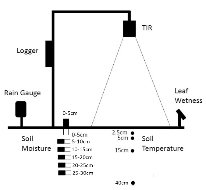 Permanent monitoring stations are supplemented by identical temporary monitoring stations, three at the northern focus area and one at the southern focus area. These short-term monitoring stations are instrumented with a rain gauge, thermal infrared sensor (Apogee), leaf wetness sensor (MEA LWS v1.1), six soil moisture sensors (Hydraprobes; 0-5 cm, 5-10 cm, 10-15cm, 15-20cm, 20-25cm and 25-30 cm) and four soil temperature sensors (MEA6507A; 2.5 cm, 5 cm, 15 cm and 40 cm depth) in order to provide time series data during the sampling period.